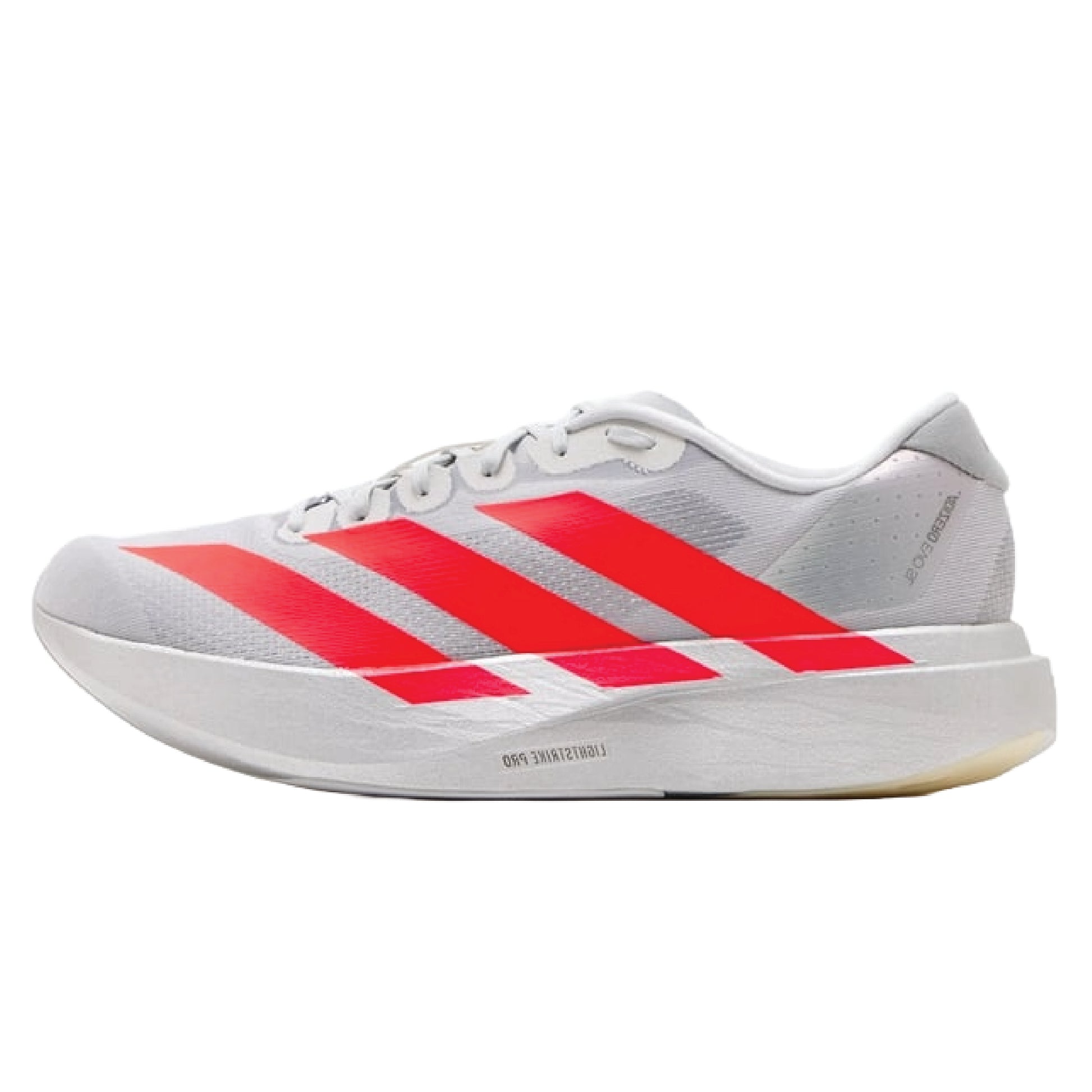 Adidas Adizero EVO SL running shoe in a silver and red colorway.